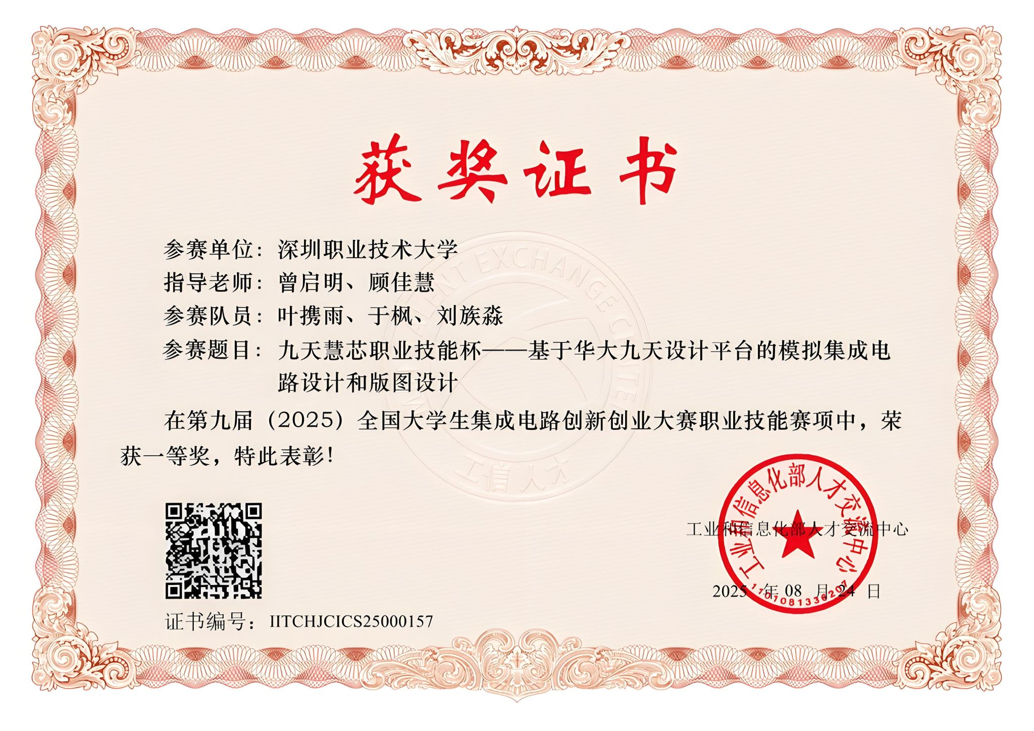 【202508】第九届(2025)全国大学生集成电路创新创业大赛职业技能赛项中《九天慧芯职业技能杯--基于华大九天设计平台的模拟集成电路设计和版图设计》荣获一等奖