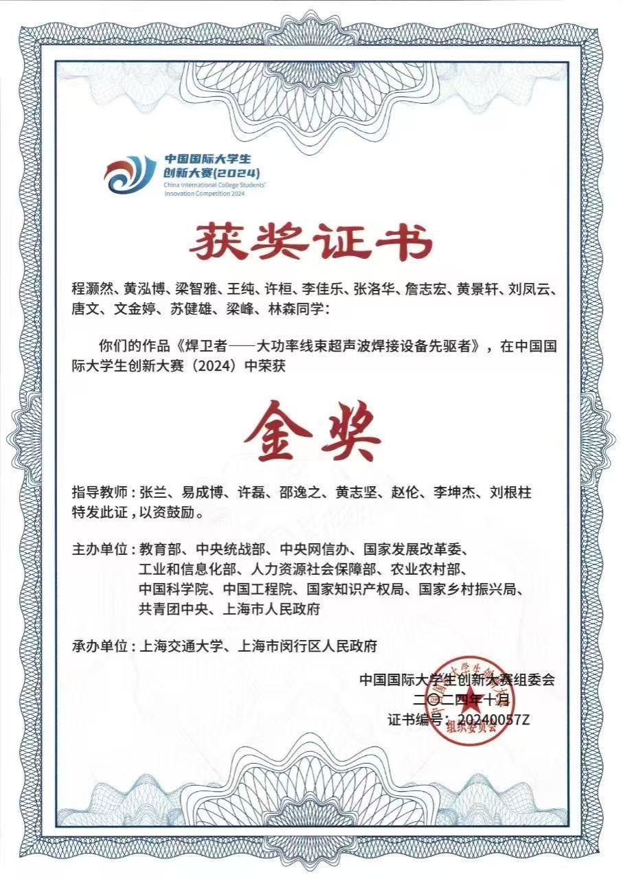 【202410】中国国际大学生创新大赛(2024)《焊卫者--大功率线束超声波焊接设备先驱者》荣获金奖