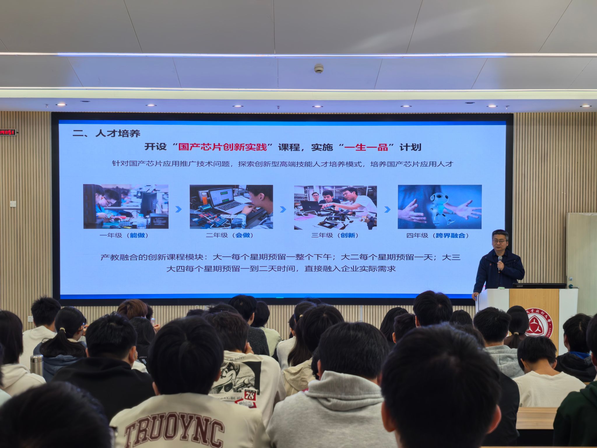 于洪宇以“集成电路人才培养”为题,介绍了大湾区集成电路产业发展的相关产业政策,对中国第三代半导体产业的发展进行了深入分析。从学院建设背景、人才培养定位和建设方案规划等方面,向同学们介绍了学院在发展中的定位和方向,阐明了未来学院将着力于AI+、机器人+、低空科技+、大健康+四个领域的产教融合发展,把创新和产业需求融入于学生教育之中。针对国产芯片应用推广技术问题,学院探索创新型高端技能人才培养模式,培养国产芯片应用人才,创新开设“国产芯片创新实践”课程,实施“一生一品”计划。最后,于洪宇鼓励同学们努力学习专业技术技能,为国家集成电路产业的自主发展和创新贡献青春力量。(集成电路学院 成博闻)